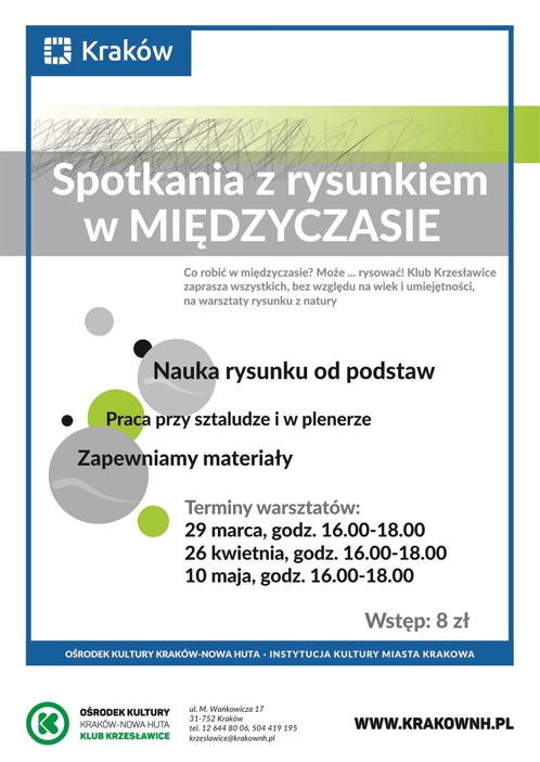 Międzyczas – na wpół mityczna kraina, w której wszystkie obowiązki, zadania i sprawy, na skutek anomalii zwanej presją czasu, załatwiają się same i to znaczniej szybciej, niż zwykle. Pomimo trudności w zlokalizowaniu, Międzyczas stanowi każdego dnia jedno z najczęściej odwiedzanych miejsc. Nie do końca poznany, kryje wiele tajemnic i wciąż nie wiadomo, co jeszcze można w nim zrobić. Ostatnie odkrycia sugerują jednak, że niezwykle interesującym zajęciem wykonywanym w Międzyczasie może być… rysowanie. Klub Krzesławice zaprasza wszystkich, bez względu na wiek i umiejętności, na kolejne spotkanie z rysunkiem. Jego uczestnicy nauczą się mile spędzać czas rysując wg. metody nauczania rysunku z natury M. Orzechowskiego. Organizatorzy zapewniają materiały i gwarantują efekty w postaci trwale wzbogaconej wrażliwości, kreatywności oraz umiejętności wyjątkowego patrzenia na świat.
